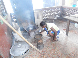 | Outdoor kitchen - they use a 'coal pot' for their cooking, which is the apparatus with smoke rising up |