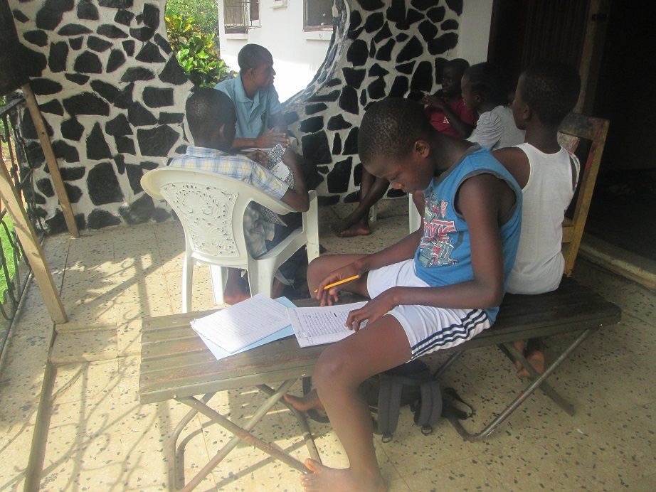 | Liberian student working on his homework on the porch of UDS Learning Center |