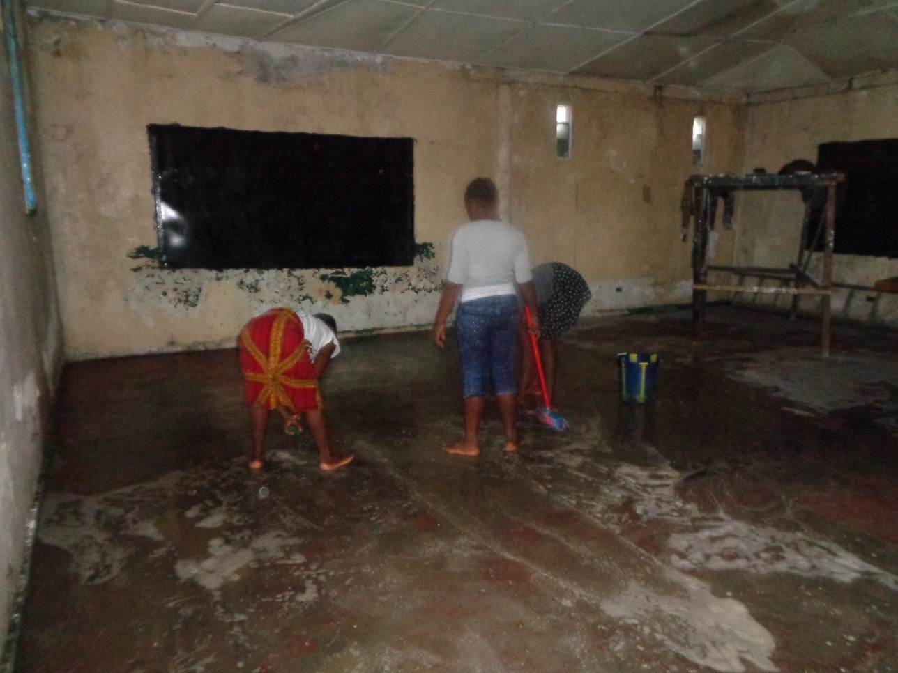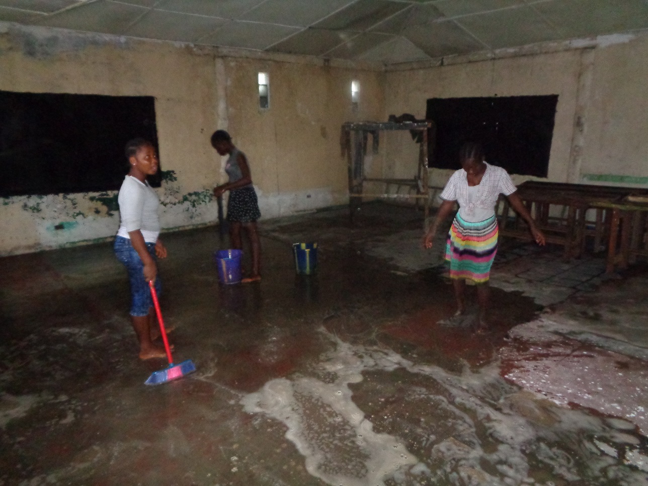 Here are photos showing some of our scholarship students--Blessing, Deborah, Ishmael, Korlu, Korlu (yes there are two), and Rita--cleaning the floor along with one of their classmates.