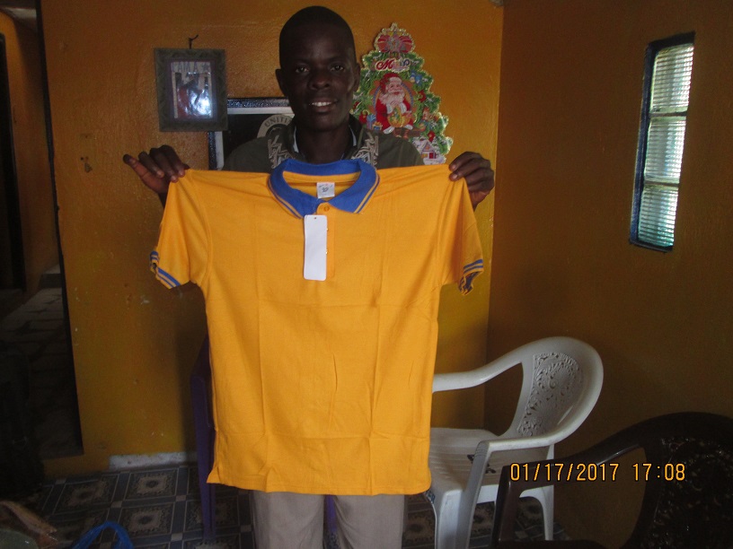| Godfrey is holding one of the shirts selected for the vocational training students' uniforms. |