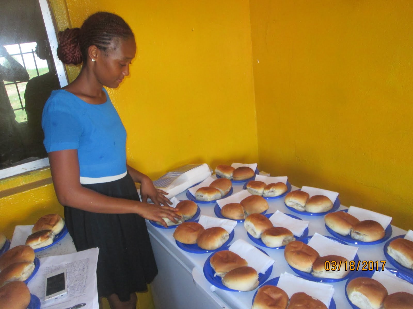 On the Liberian end, there were about 100 youth who came to be a part of this Google Hangout meeting with students in Minnesota, and all our UDS instructors were there as well. The youth received refreshments which our catering students helped prepare. Pictured below (left) is a sandwich called "light bread," made with cabbage, sausage, and other vegetables. Everyone who attended the event in Liberia received two sandwiches and a soft drink.
